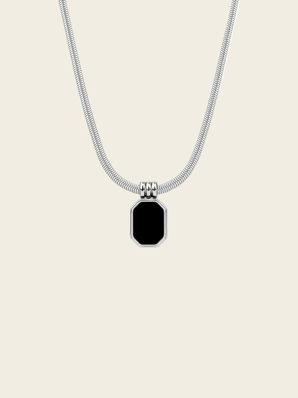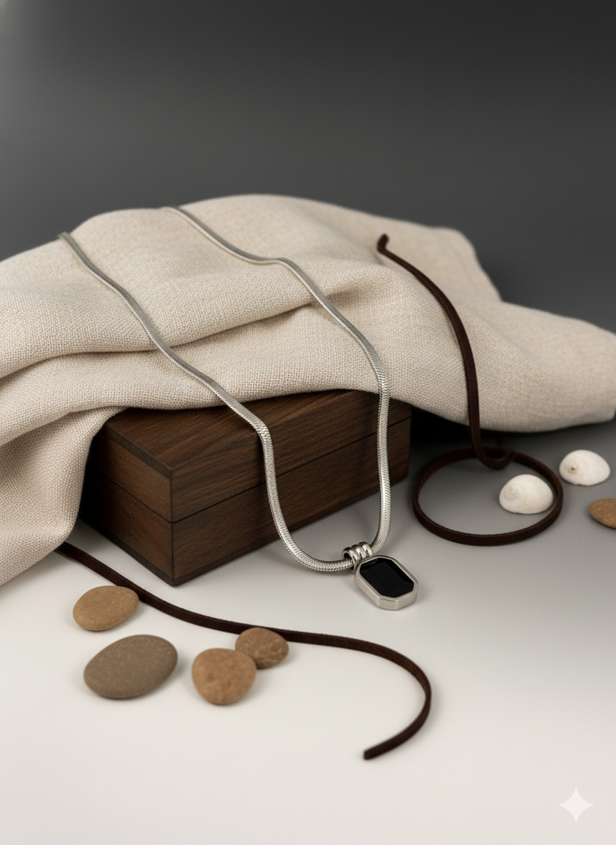 Meet the Black Onyx Rectangle Pendant Necklace from Rahre, a modern piece designed for anyone who loves clean lines and timeless style. The necklace features a polished stainless steel chain paired with a smooth black rectangular pendant that stands out without feeling overpowering. It’s the kind of piece you can wear with everything: casual outfits, evening looks, or layered with other necklaces for a curated styling moment.