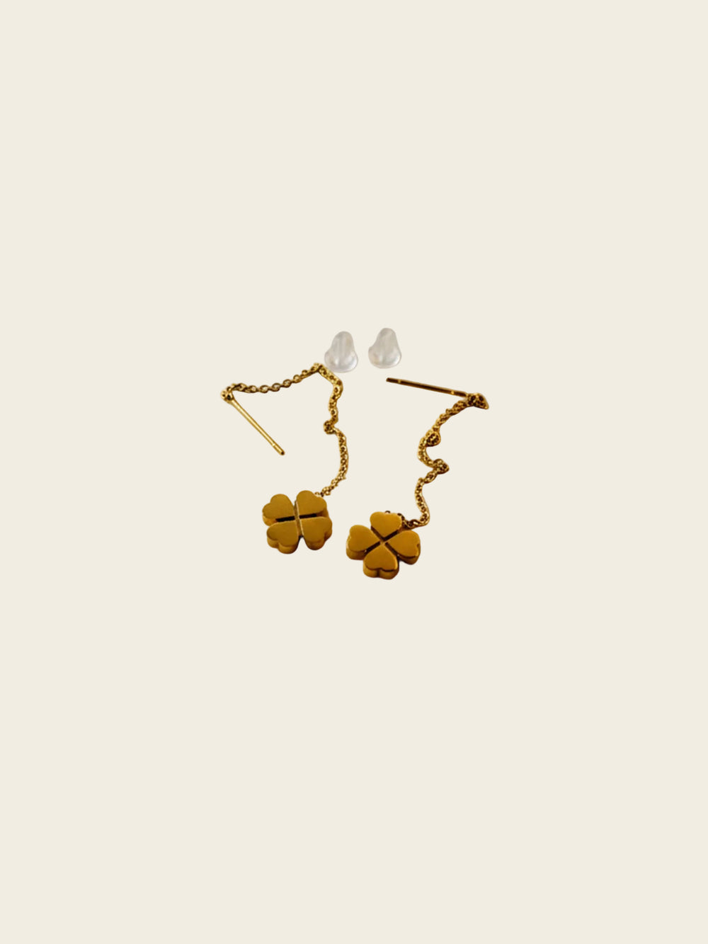 Delicate gold-tone chain drop earrings with tiny clover charms, crafted in stainless steel for lasting shine and easy everyday wear.