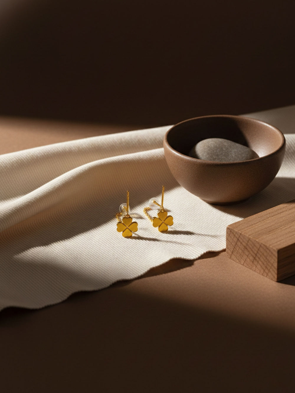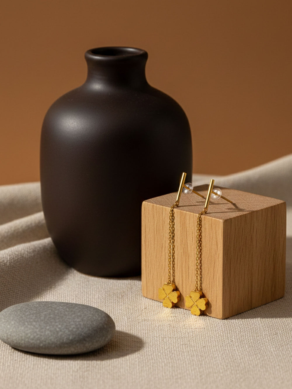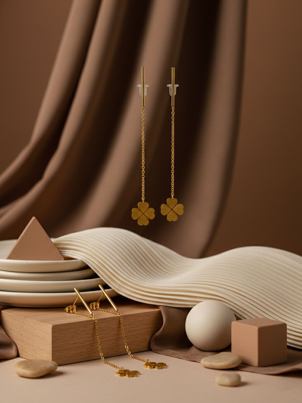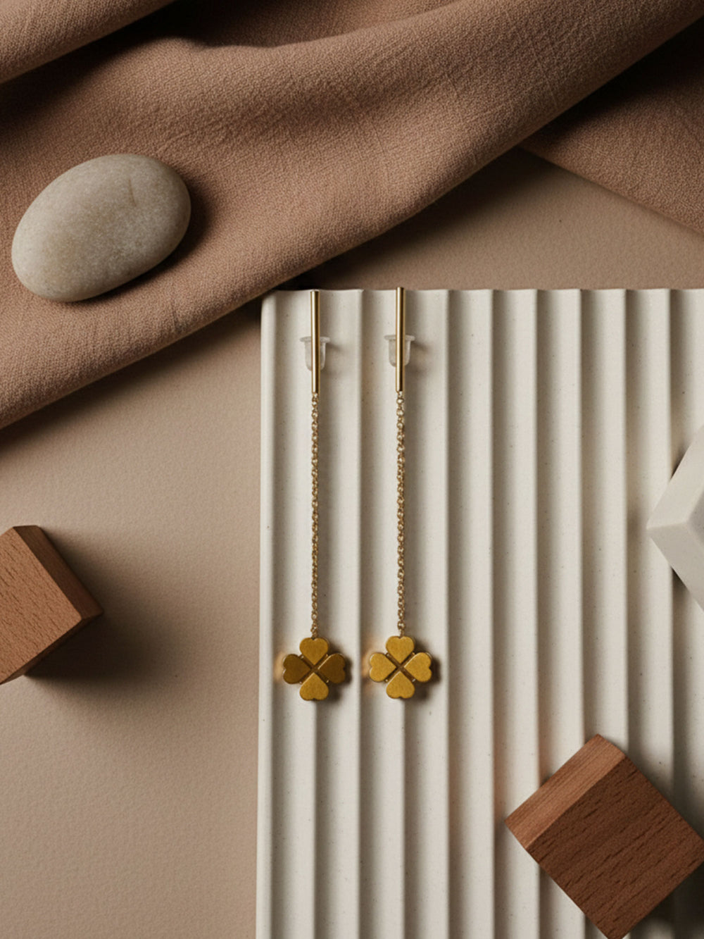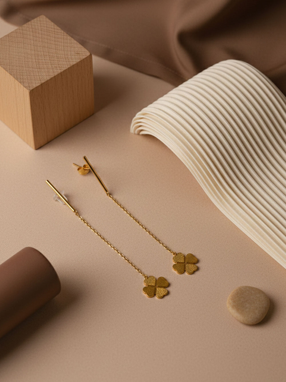 The RAHRE Clover Chain Drop Earrings add a soft, feminine touch to your look. Each earring features a slim chain that falls from a simple hook, ending in a small clover-shaped charm with smooth, rounded petals. The design is light and minimal, so the clovers move gently as you do and catch the light in a subtle, pretty way.