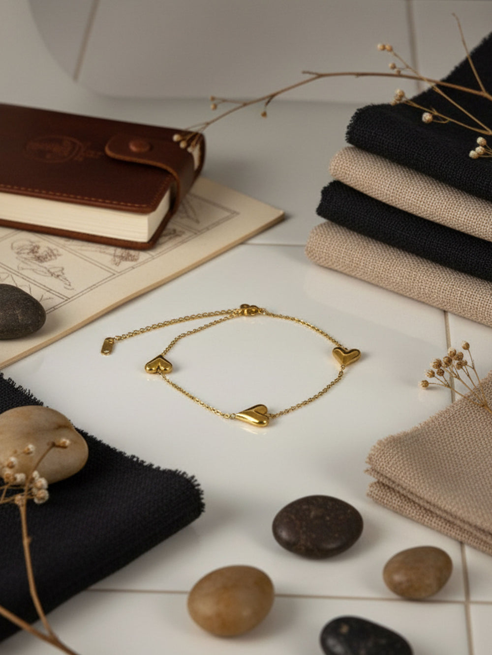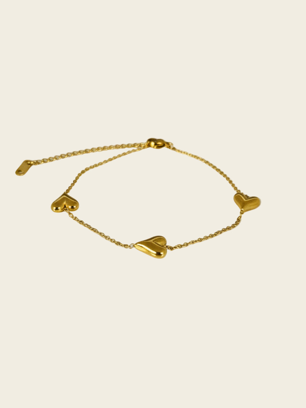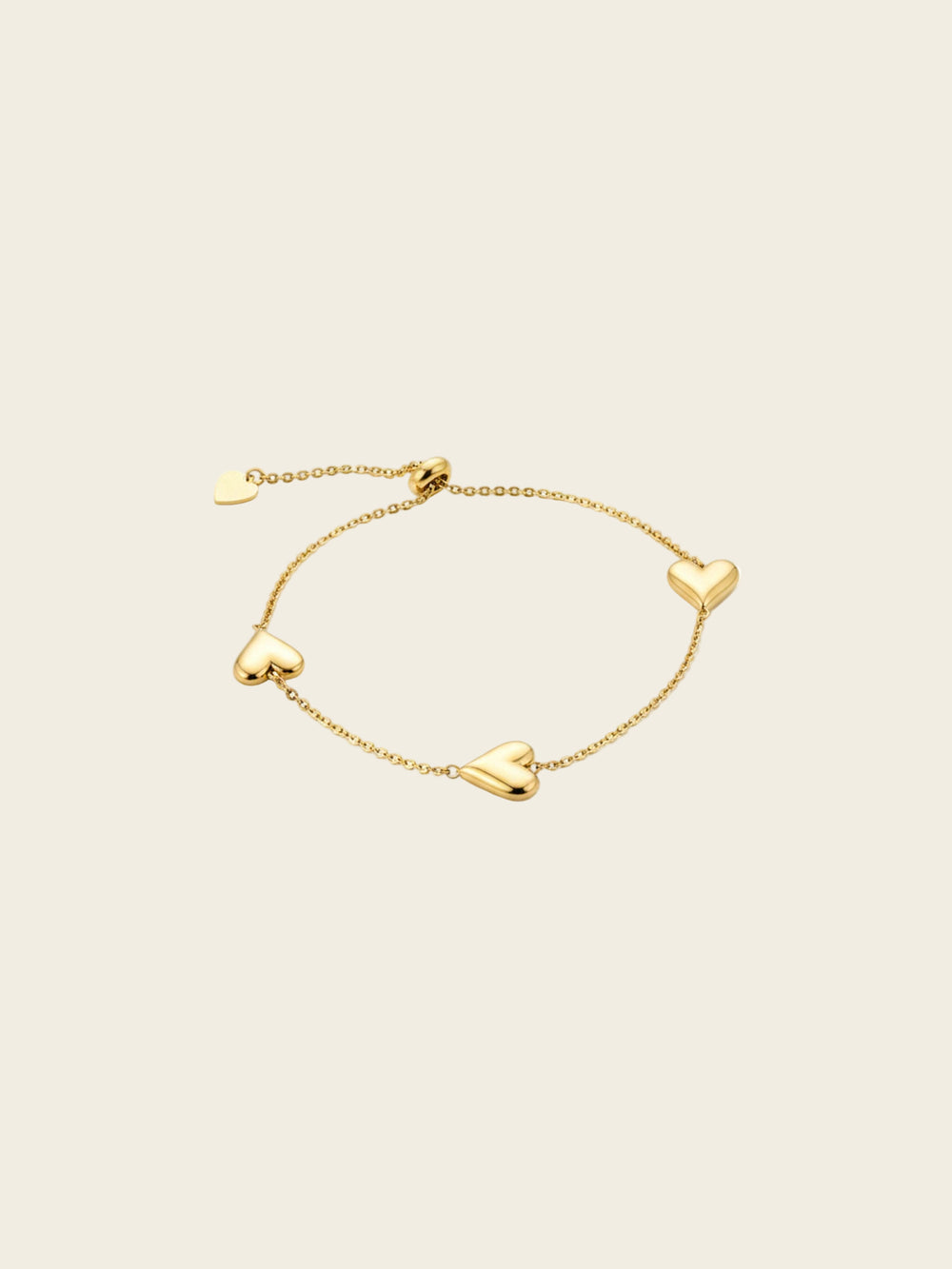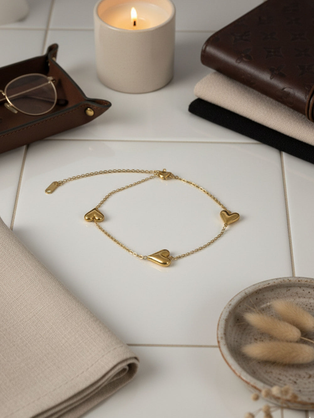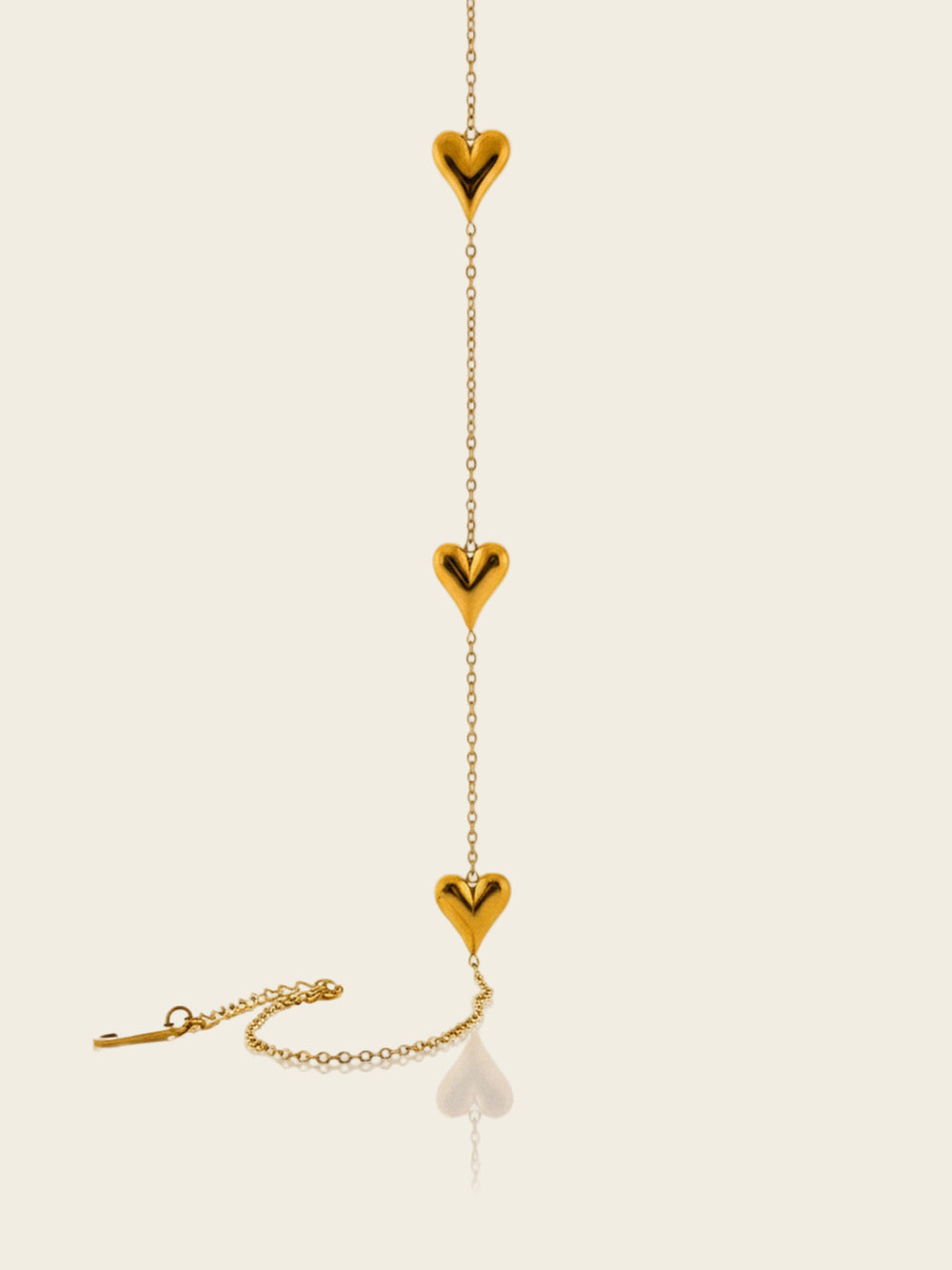 Add a soft, romantic touch to any outfit with the Golden Heart Chain Bracelet by Rahre. This elegant piece features three polished heart charms spaced along a slim gold chain, creating a clean, feminine look that’s easy to style day or night.Made from premium stainless steel with a rich gold tone, the bracelet is built to last and stay bright.