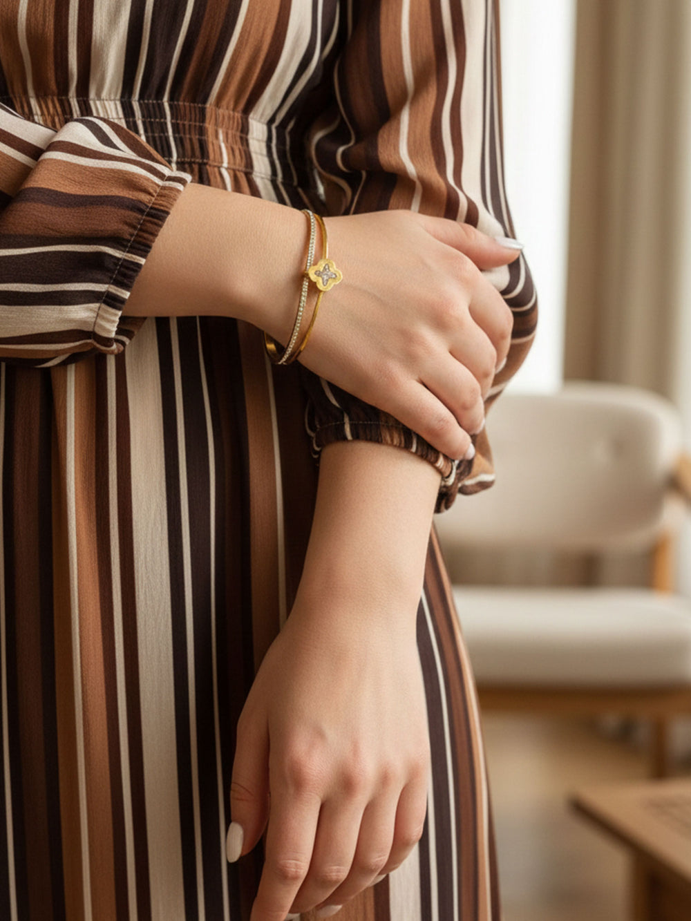The Golden Radiance Stainless Steel Bangle by Rahre is a must-have for anyone who loves simple yet luxurious jewelry. Crafted from premium stainless steel, this bangle offers long-lasting shine, a smooth golden finish, and a lightweight feel that makes it wearable all day. Its minimal design makes it perfect for stacking or wearing solo as an everyday statement.