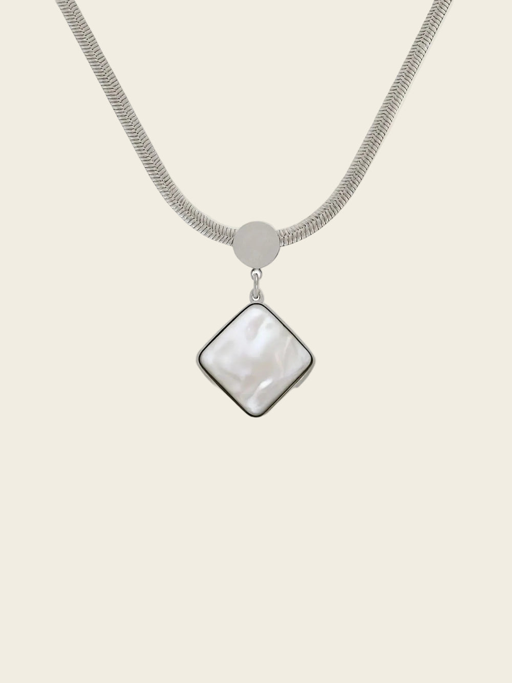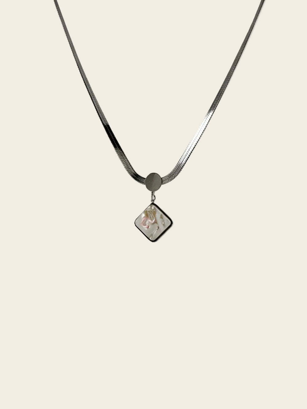 A sleek stainless steel necklace with a soft pearl-glow square pendant that shines through everyday wear. Made for lasting sparkle and daily comfort.