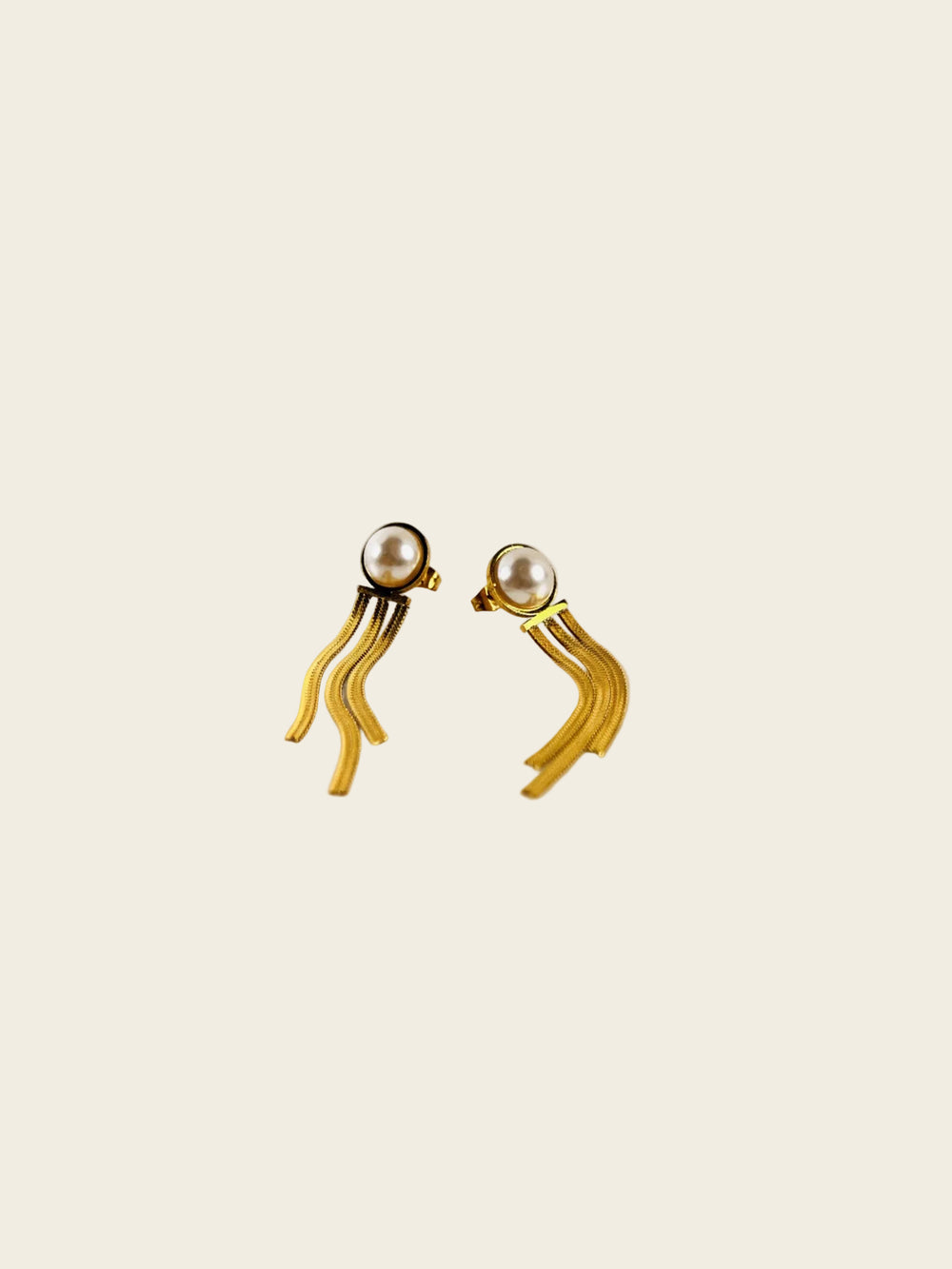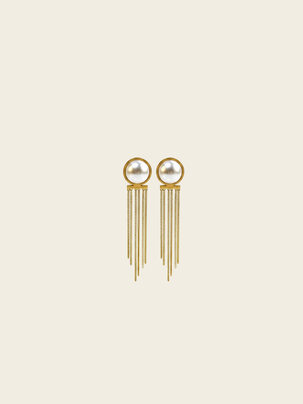 Gold-tone stud earrings with a soft pearl-style top and fine tassel strands, crafted in stainless steel for lasting shine and easy everyday wear.