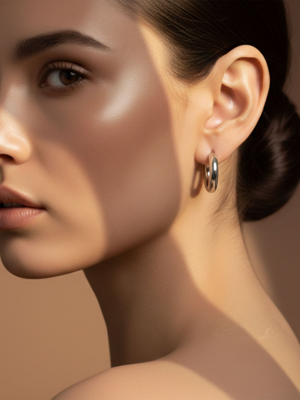 These polished mini hoop earrings are the kind of piece you reach for without thinking. Their simple, rounded shape and smooth, mirror-like finish add a clean touch of shine to any look, from casual tees to a dressed-up evening outfit.
