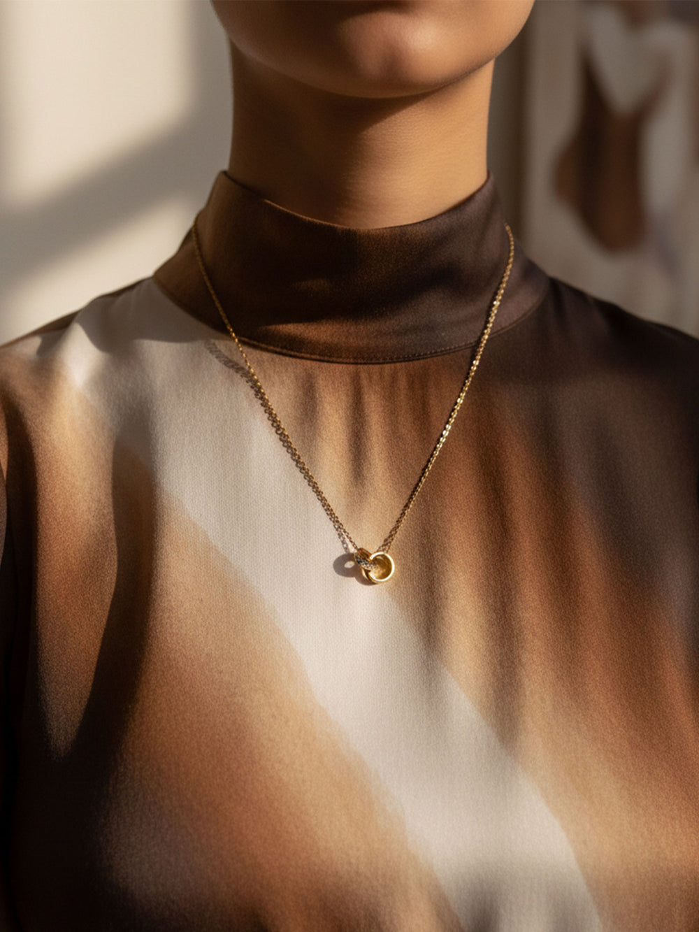 A shiny gold-tone necklace with two interlocking rings, one set with bright stones, made in durable stainless steel for everyday wear.